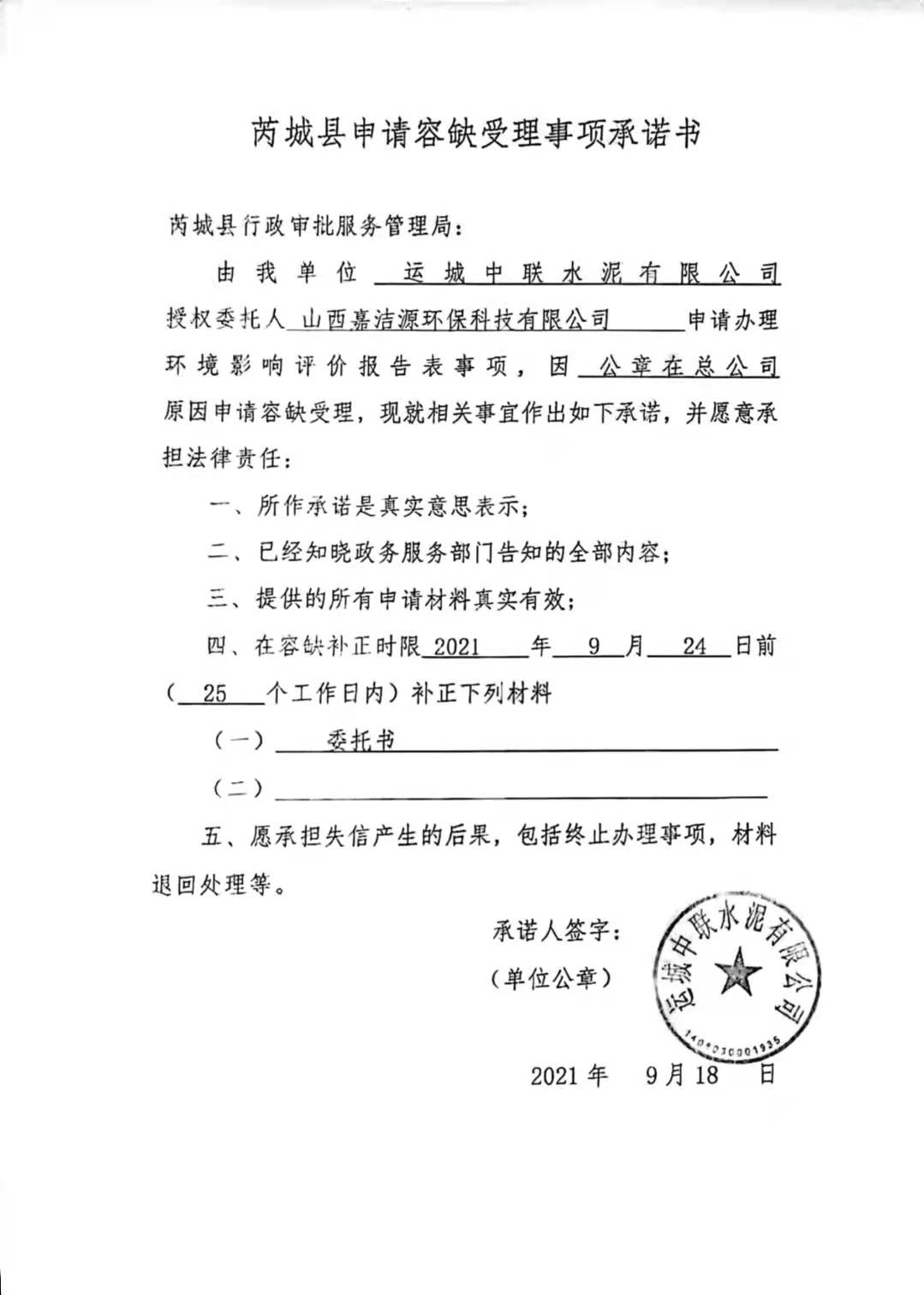 承诺主体代码:91140800558723064J 签署日期: 2021-09-18