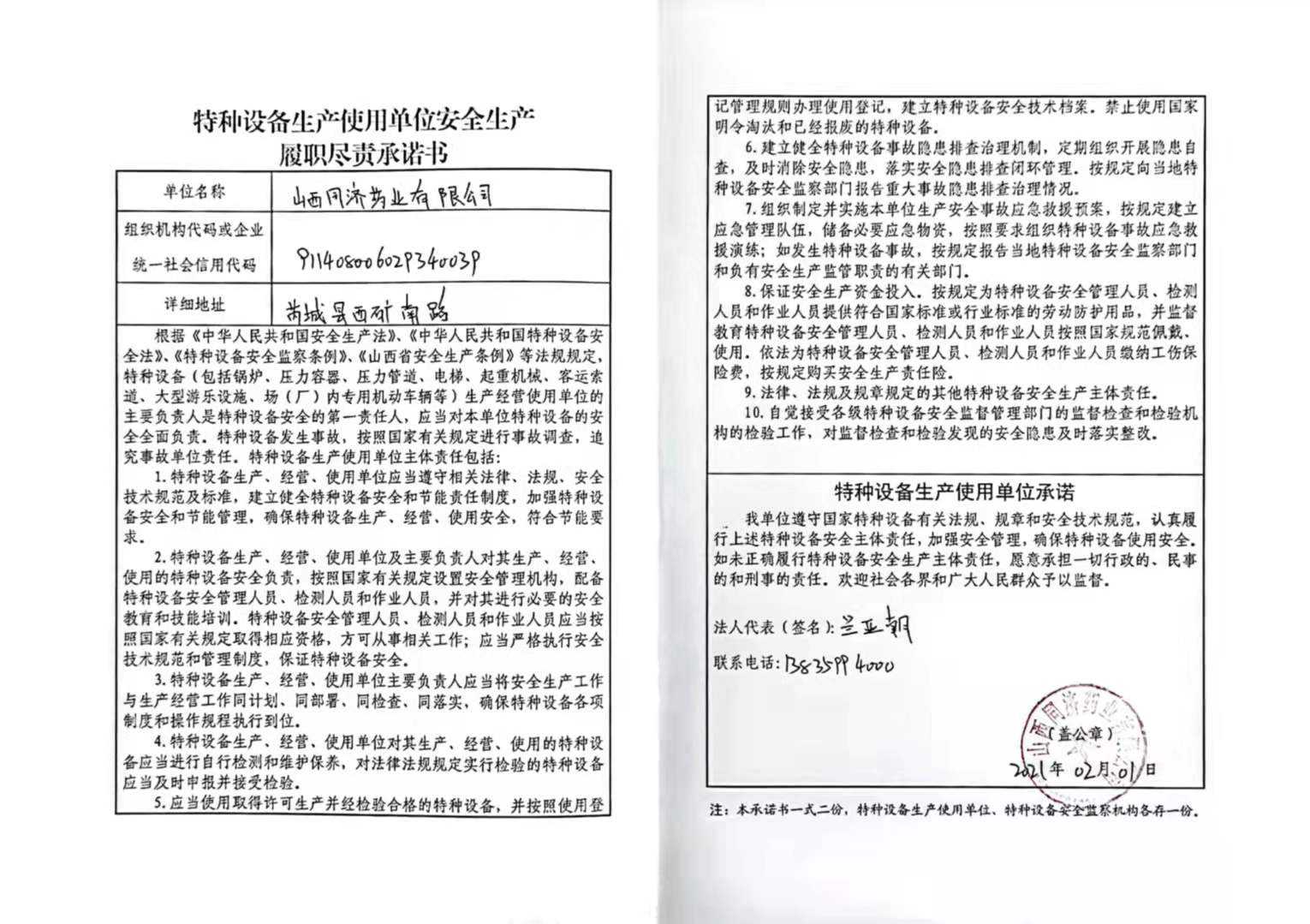 承诺主体代码:911408006029340039 签署日期: 2021-02-01
